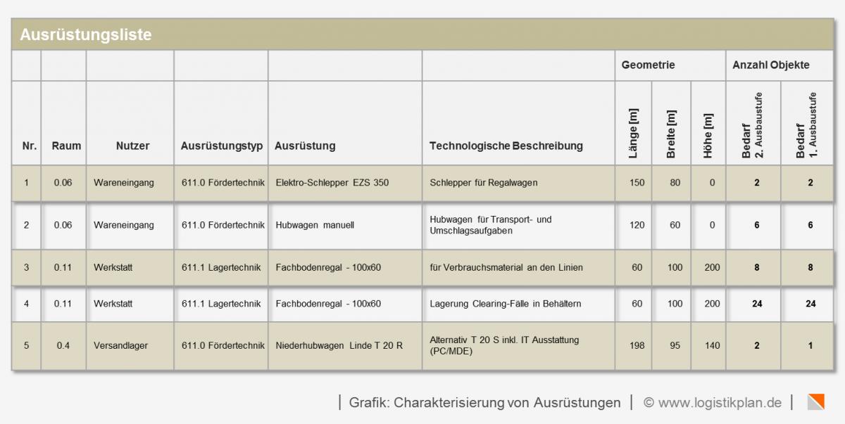 - Overview of all equipment data in the equipment list (LogistikPlan method standard)