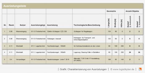 - Overview of all equipment data in the equipment list (LogistikPlan method standard)