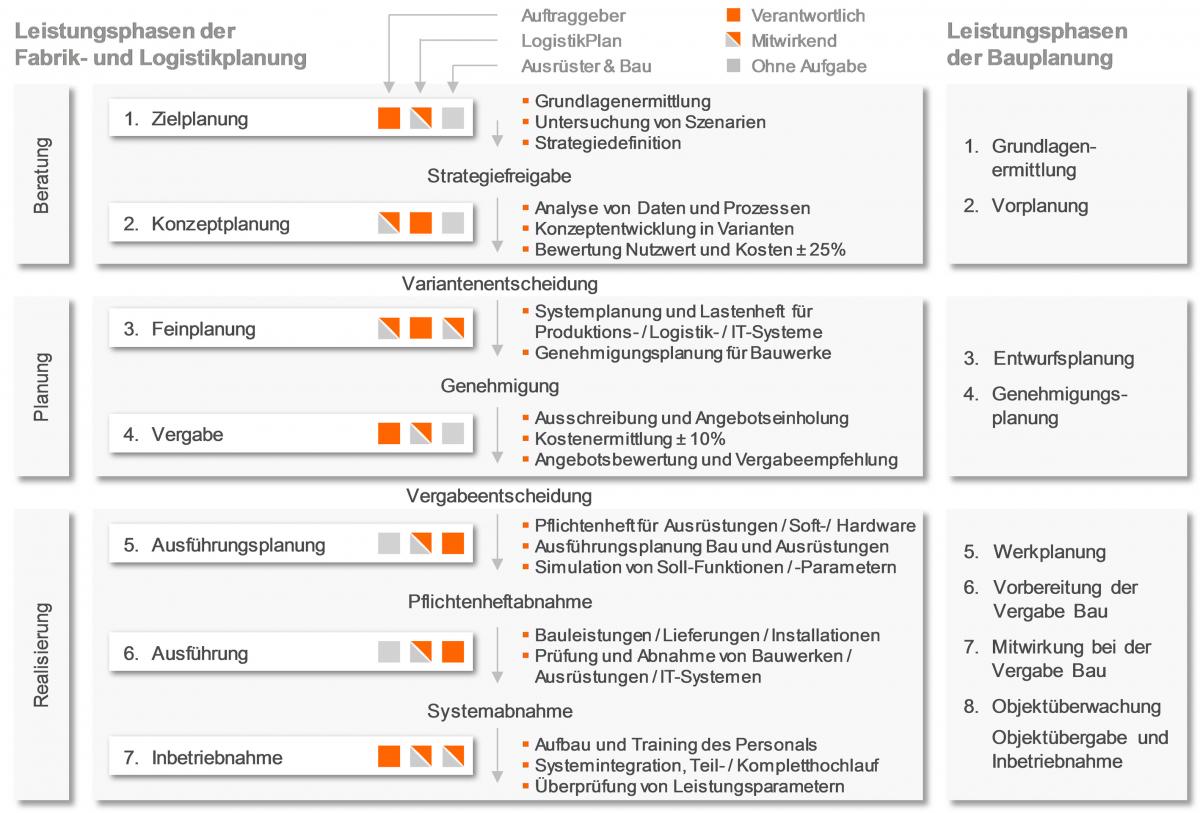For the planning and implementation of Production Systems and Logistics Systems, LogistikPlan applies a proven methodological standard: seven consecutive project phases assigned to the individual project steps in Factory Planning, Logistics Planning, and industrial construction planning.