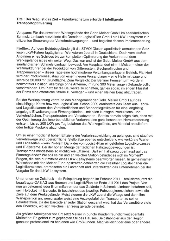 Für das erweiterte Werksgelände der Gebr. Meiser GmbH im saarländischen Schmelz-Limbach konzipierte die Dresdner LogistikPlan GmbH ein LKW-Leitsystem zur effizienten Steuerung der Verkehrsbewegungen - und begleitet dessen Implementierung.
